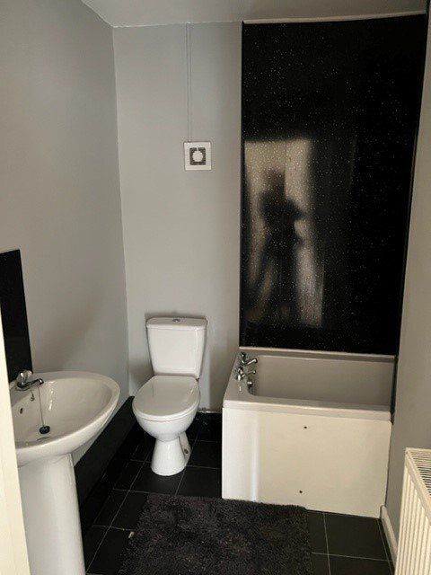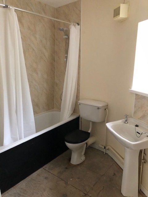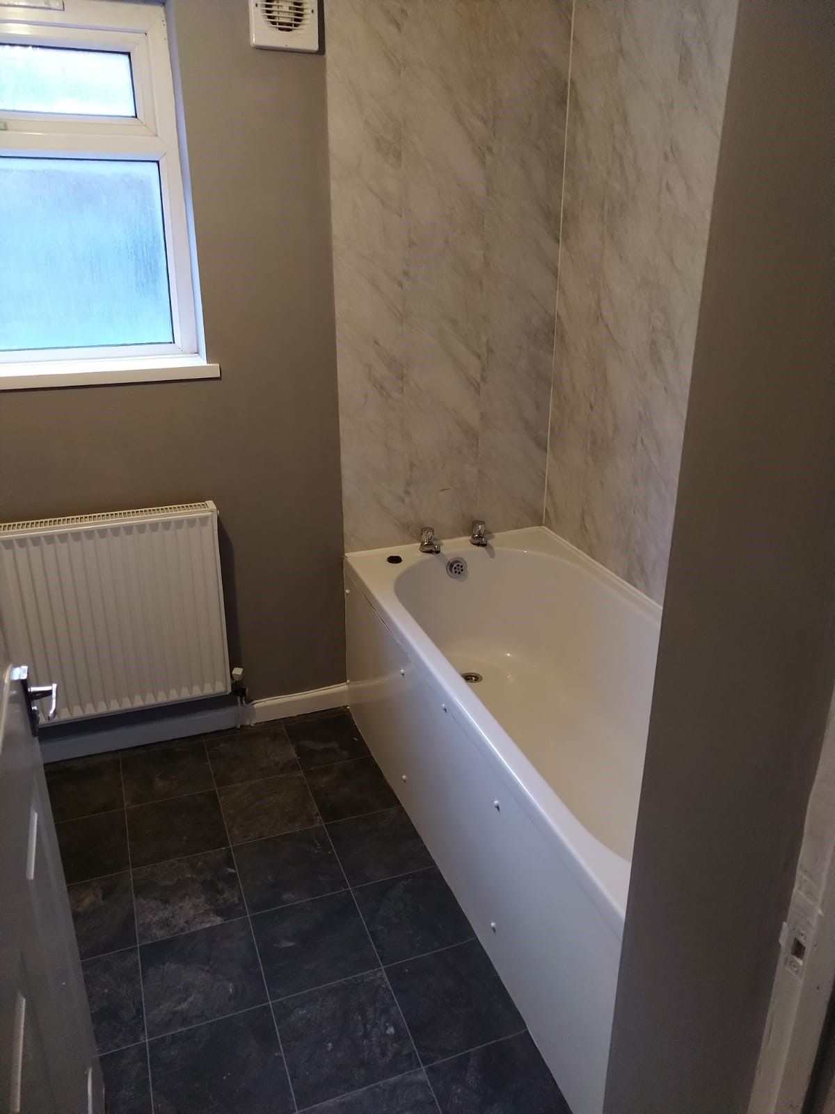 Bathroom: Three piece suite comprising of a bath, wash hand basin and toilet in cream. A radiator, extractor fan and new vinyl flooring. New cladding around bath and sink area.
