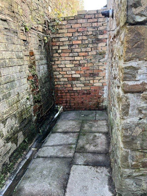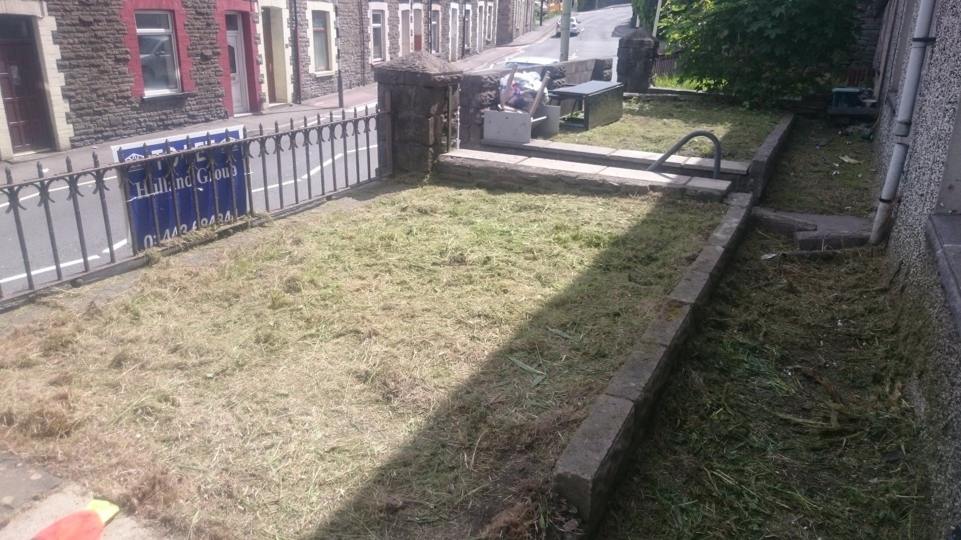 EXTERNAL - Small forecourt to front of property with steps, nice size enclosed rear garden up steps and a concrete back yard area with a small out building.