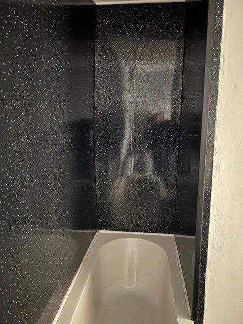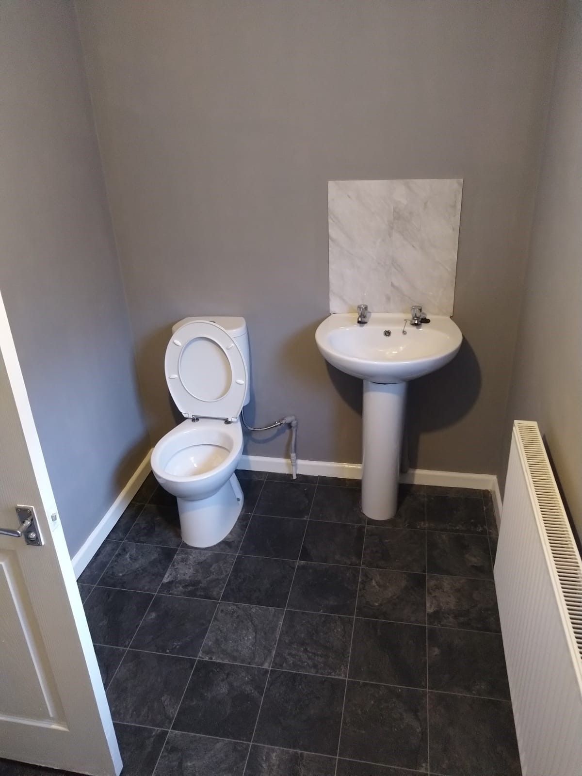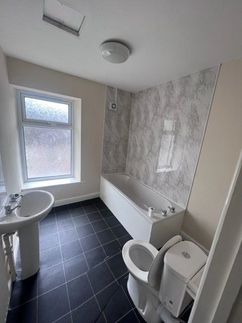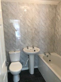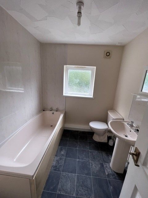 BATHROOM - Three piece suite comprising bath, w.c. and wash hand basin in white. Radiator. UPVC panels around bath up to ceiling, with matching upvc splash back above hand basin. New vinyl flooring. Extractor Fan.