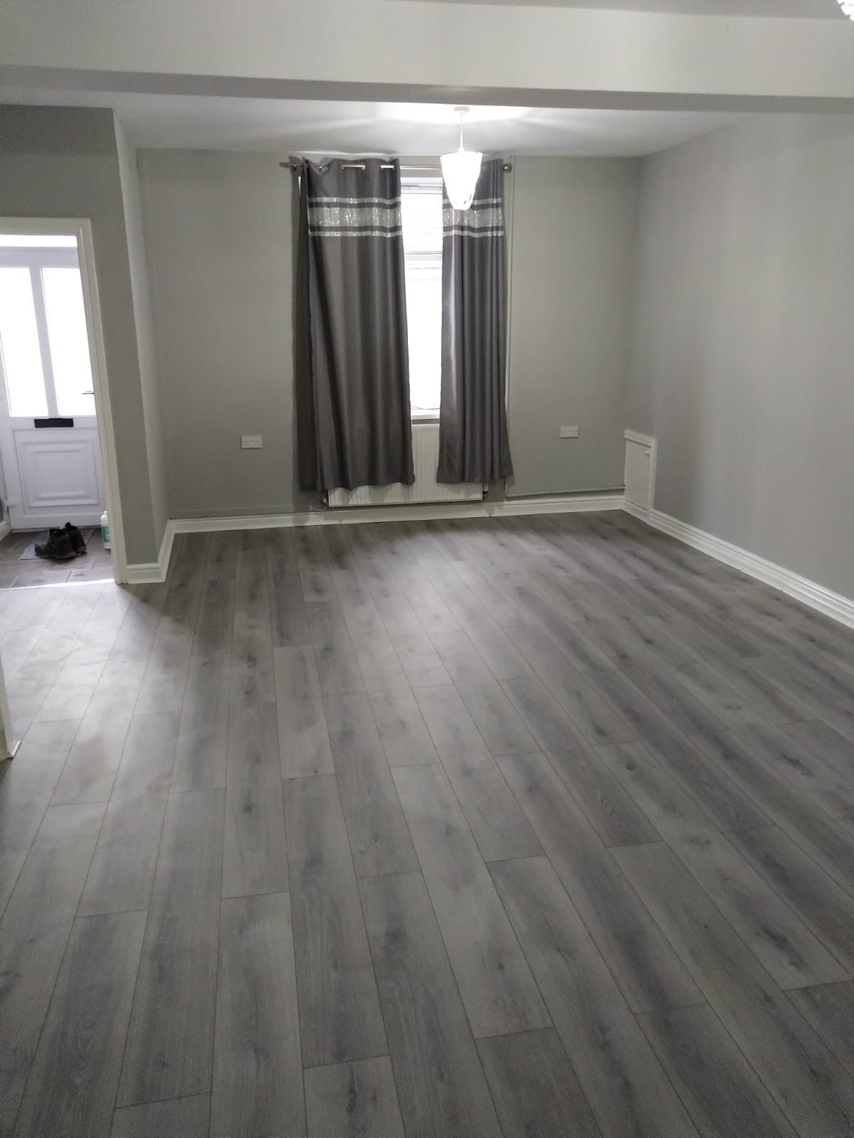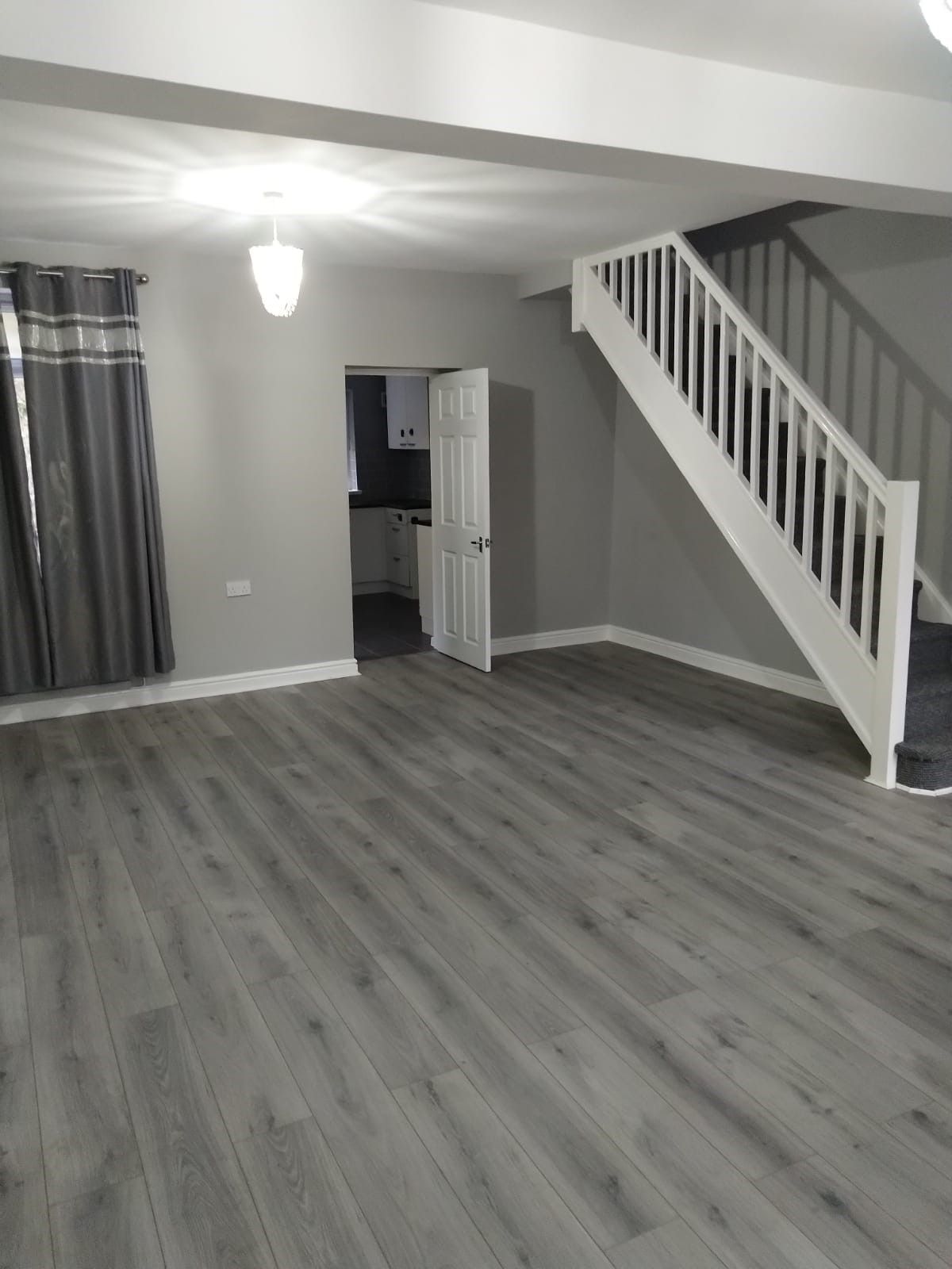 LOUNGE - Light, bright and pleasant spacious double lounge, windows to front and rear. Radiators. Grey laminate flooring, electric points and smoke alarm. Door leading to kitchen. Stairs leading to 1st floor.