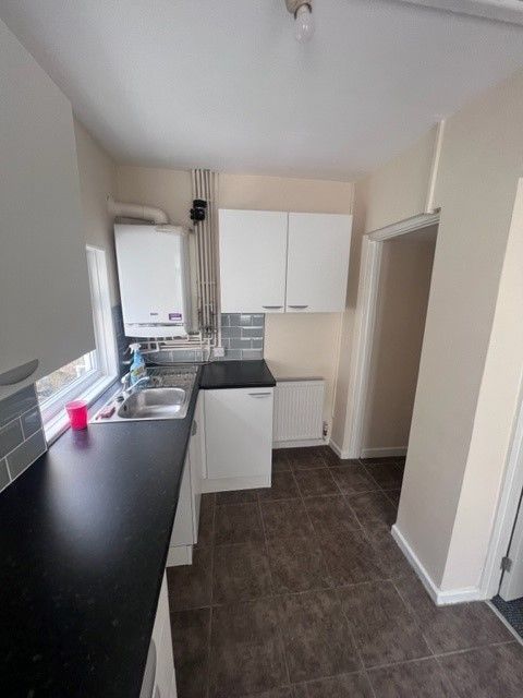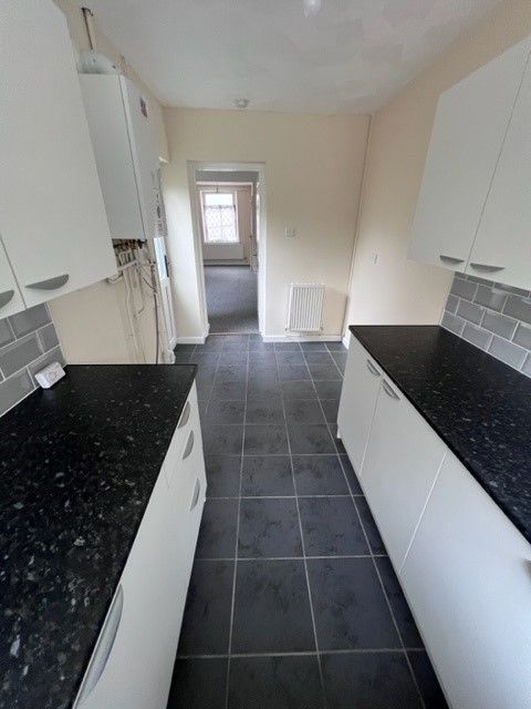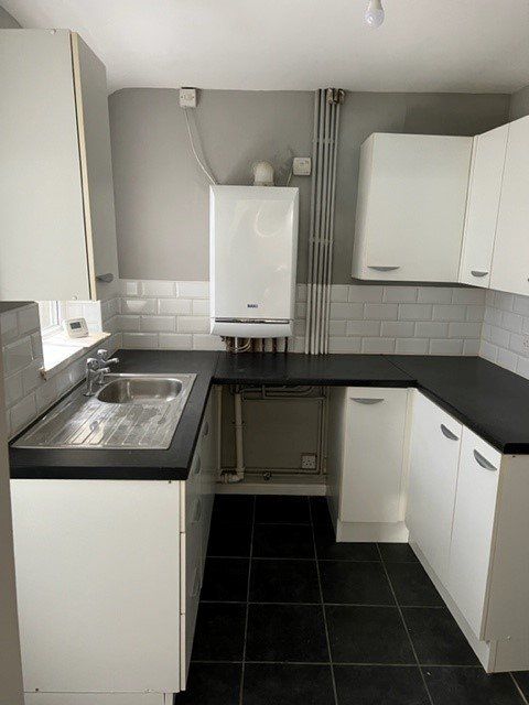 KITCHEN - Fitted kitchen, comprising s/s sink with a range of base and wall units, with worktops and tiled splashbacks. Radiator. Tiled Floor. Combi Boiler, Electric and Gas cooker points. Electric points. Carbon monoxide alarm. Window, and UPVC door leading to back yard.